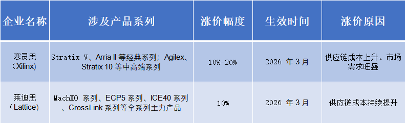 其中,赛灵思对 Stratix V、Arria II 等经典系列提价 20%,Agilex、Stratix 10 等中高端产品线%;莱迪思则针对 MachXO 系列、ECP5 系列等核心产品上调 10%,覆盖工业控制、通信设备、消费电子等主流应用场景。