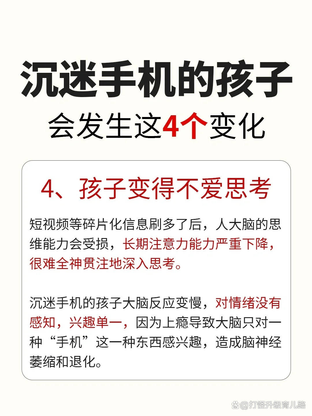 手机上的信息往往是一闪而过,缺乏深度和思考性。孩子长期接触这样的信息,会变得不爱思考,缺乏创造力和分析能力。此外,过度使用手机还会导致孩子缺乏探索精神,不愿意尝试新的事物和挑战自己。