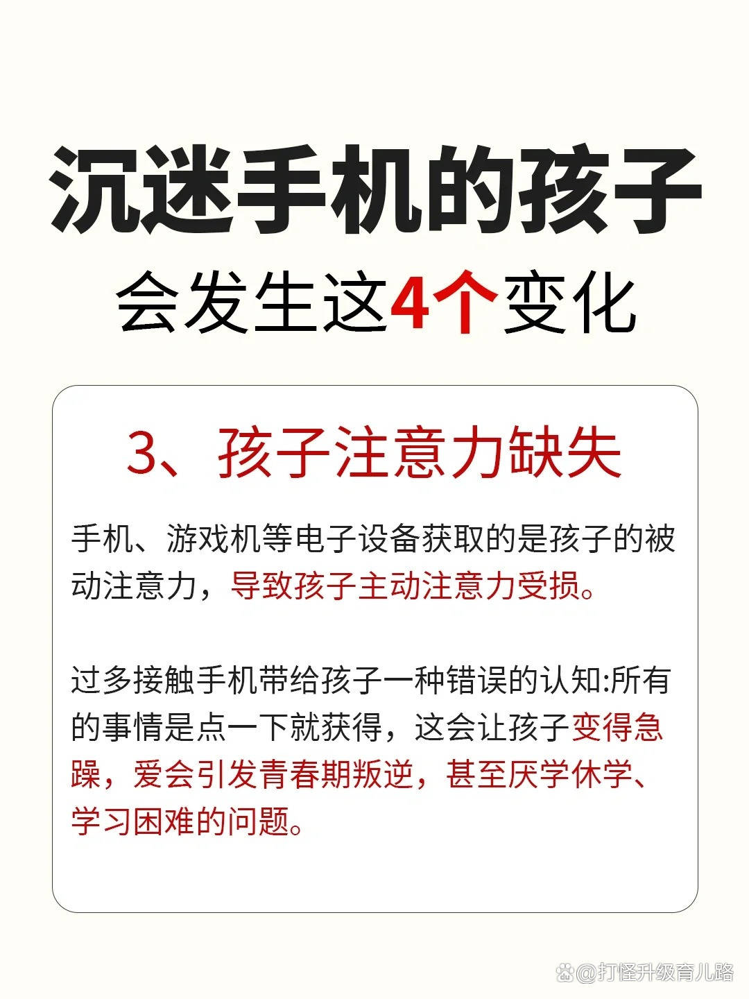 手机上的信息量很大,而且不断更新,这会导致孩子的注意力被分散,难以专注于一件事情。长期下去,孩子的注意力集中度会受到影响,学习效率也会降低。此外,过度使用手机还会导致孩子出现焦虑、抑郁等心理问题。