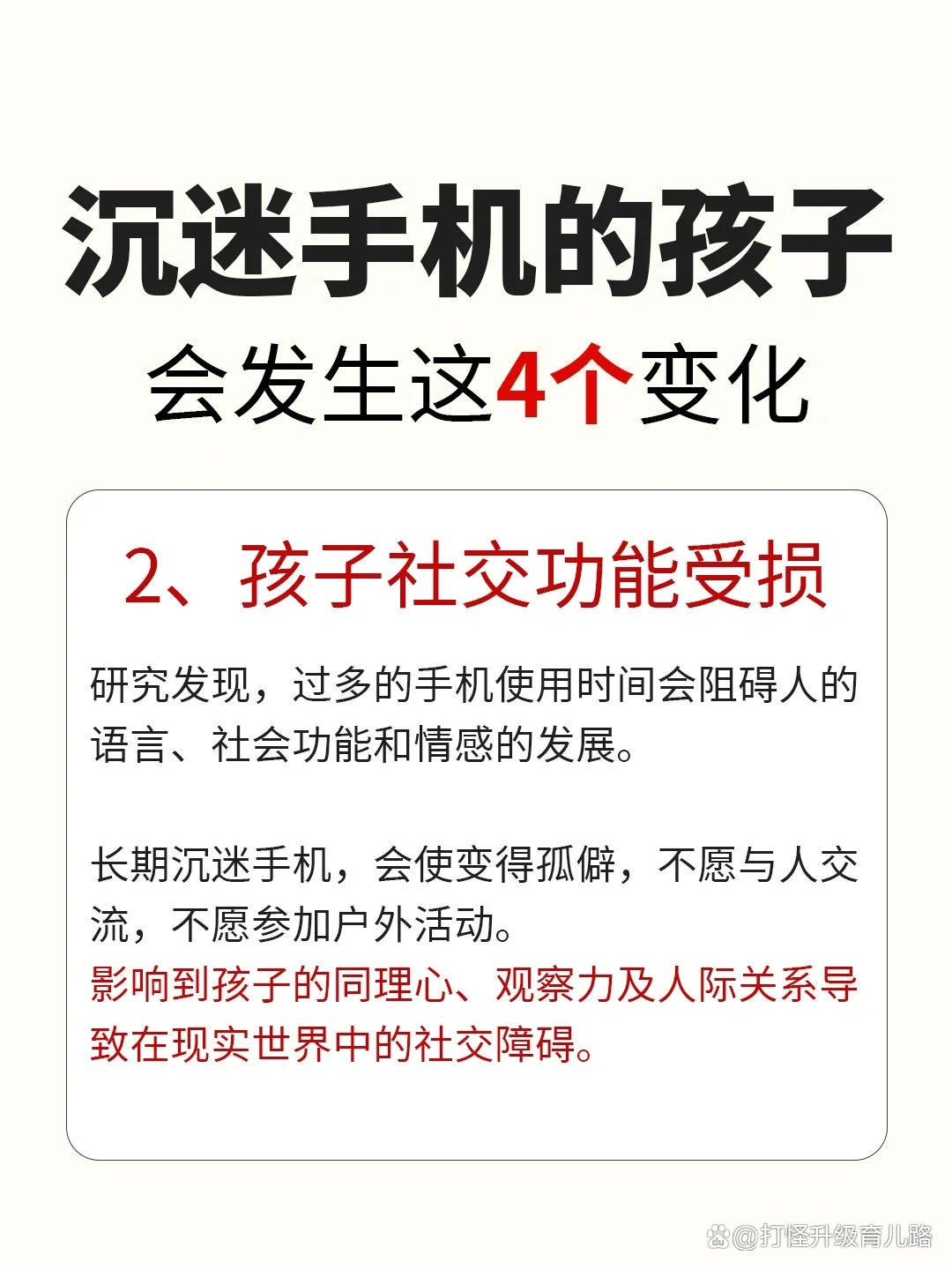社交是人类的基本需求之一,也是孩子成长过程中必不可少的一部分。然而,手机沉迷会导致孩子缺乏与他人的互动和交流,从而影响他们的社交技能和情感发展。长期缺乏社交互动会导致孩子的社交功能受损,使其难以建立健康的人际关系。