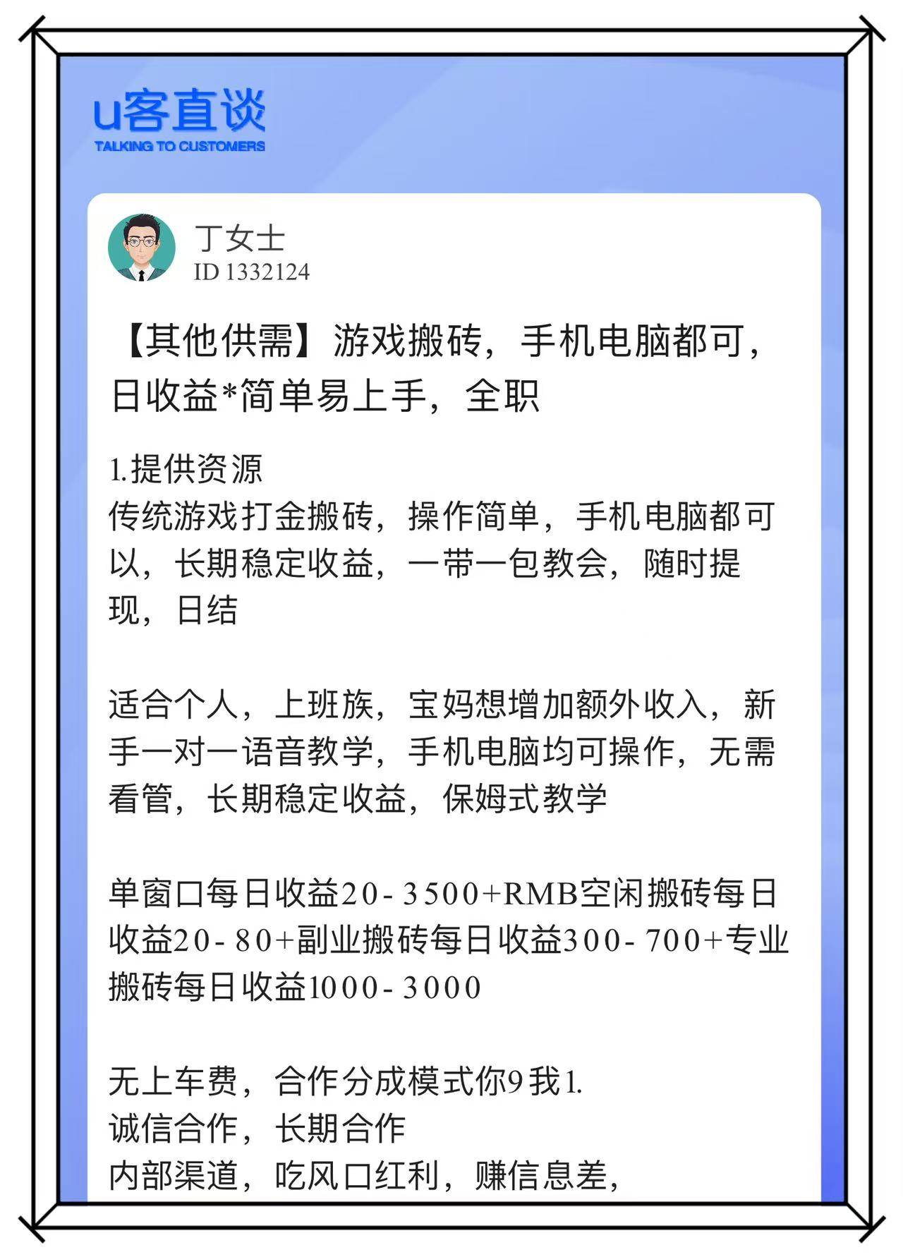 当然,如果你是一名打金搬砖新手,那么我更建议从小规模的游戏类型尝试。不知道如何下手,便可借助U客直谈、闲创无忧等商务资源对接平台,寻找靠谱的游戏搬砖工作室搬砖资源。在这里,会有前辈带着你一起做,对于新手而言更能快速上手,赚到第一桶金。