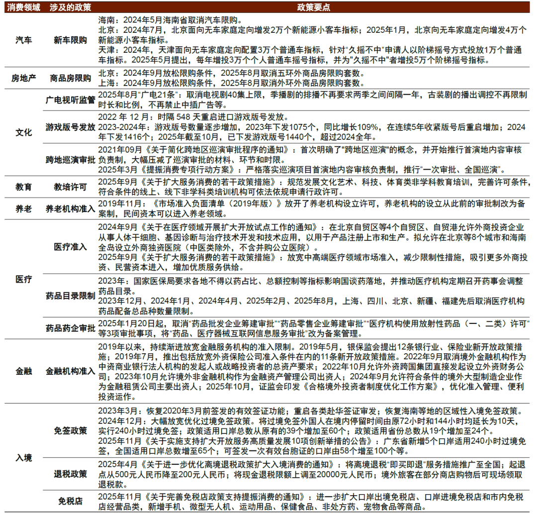 2025年以来,“清理消费领域限制性措施”成为重要政策方向。3月《提振消费专项行动方案》提出“限制措施清理优化行动”,要求“有序减少消费限制”、“持续优化营商环境”[6]。4月中央政治局会议“尽快清理消费领域限制性措施”[7]、8月国务院第九次全体会议“系统清理消费领域限制性措施”[8]、10月“十五五”规划《建议》“完善促进消费制度机制,清理汽车、住房等消费不合理限制性措施,建立健全适应消费新业态新模式新场景的管理办法”[9]、12月中央经济工作会议“清理消费领域不合理限制措施,释放服务消费潜力”[10],将清理消费限制指向了汽车、住房、服务等消费领域,并要求建立健全管理办法。
