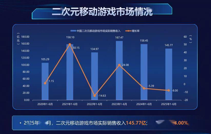根据中国音数协游戏工委发布的报告,2025年上半年,二次元移动游戏市场的实际销售收入为145.77亿元,同比下降了8%,这也是继2024年下降7.44%后的,再次下滑。