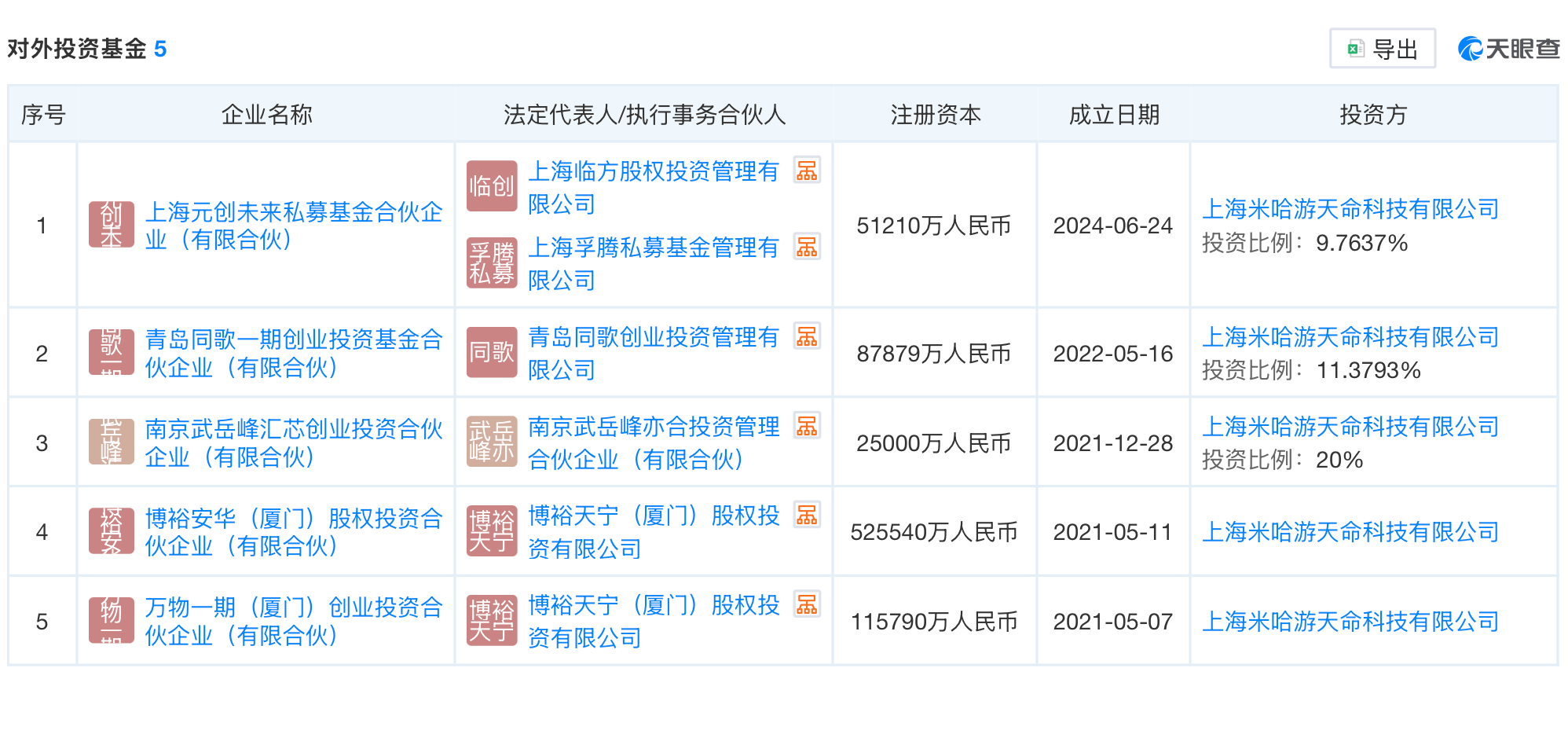此后,米哈游又在2022年5月和2024年6月,分别参股青岛同歌一期创业投资基金合伙企业(有限合伙)和上海元创未来私募基金合伙企业(有限合伙),前者由同歌创投管理,米哈游持股11.3793%,后者由孚腾资本管理,米哈游持股9.7637%。