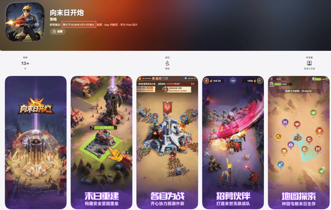 《向末日开炮》采用末日丧尸题材,底层框架类似《Last War》,早些时候已上线小游戏且受到一定关注,目前其苹果商店预约页面显示游戏将于1月31日正式推出,鉴于前作的成功,该作未来表现值得关注。