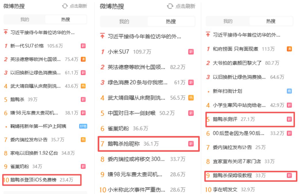 公测当天《鹅鸭杀》相关话题在全网持续发酵,累计登上微博、抖音、快手、B站等平台热搜榜近百次,形成现象级传播,部分“极品ID”更是以大几千元的价格出现在二手平台。在App Store及各大安卓渠道,游戏占领免费榜、热门榜等多个榜单首位。