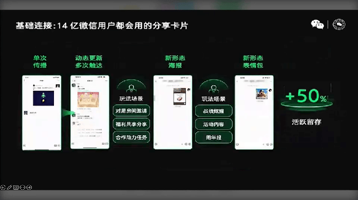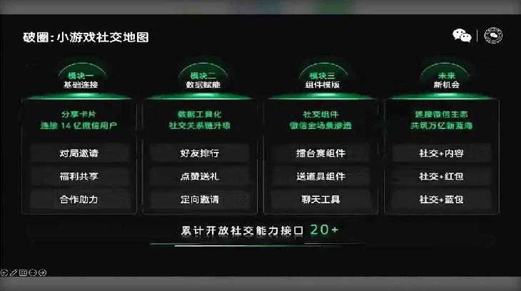 其次,游戏方面,微信公开课讲师岑俊图做了不少社交板块方面的提及,除了包含分享卡片、邀请组队、好友排行等原始常见的内容外,福利共享、社交+红包/蓝包方向,也将会成为本年的探索点。同样,在微信小游戏的陌生社交趋势逐步增强的时候,作为游戏厂商也应当根据游戏自身,寻求对应的匹配方向。以《月之村》为例,与其他包含社交属性的轻度产品有所不同的是,熟人社交——泛熟人社交——泛社交才是相对更适合产品自身调性的内容。一方面,熟人社交自身优势在于天然的信任度、粘性,从熟人到泛熟人社交为基础的游戏互动、玩法设计,提供了超越游戏玩法自身的价值,即泛熟人社交下的“破冰”社交硬通货。另一方面,熟人及泛熟人社交可以透过口碑的形式,形成有效的增长裂变,降低后续的用户获取成本。