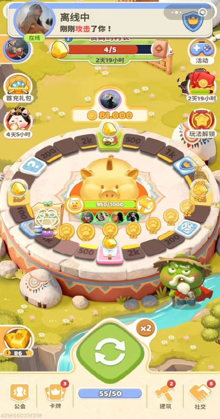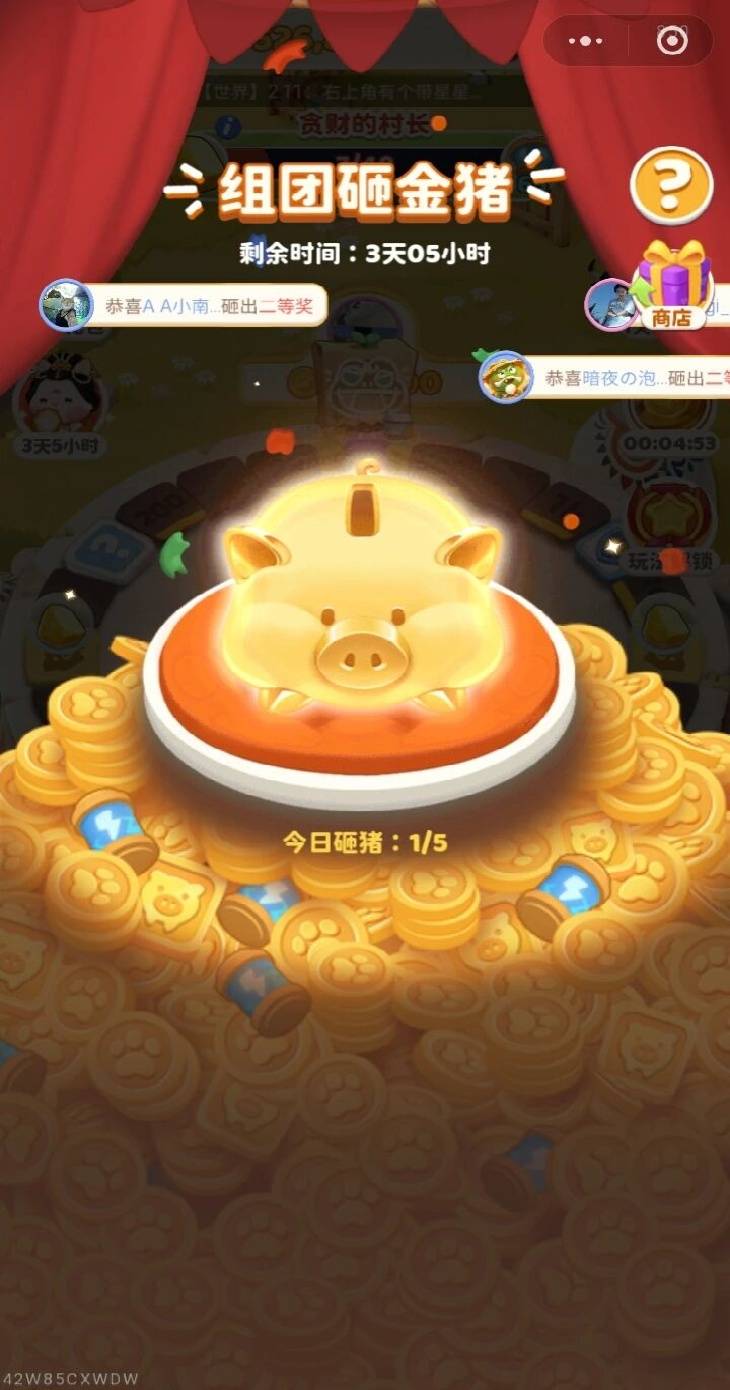 第二重社交,则是透过固定活动形成。“砸金猪”玩法,则是形成用户的陌生社交。砸金猪玩法由最多4名玩家参与,不足4名也可以进行。整体上,砸金猪的互动设计并不强制玩家之间参与,但基于“越多活跃玩家共同组队参与越容易完成”的利益驱动下,则顺其自然提升社交粘性,促进用户之间游戏内相互添加。
