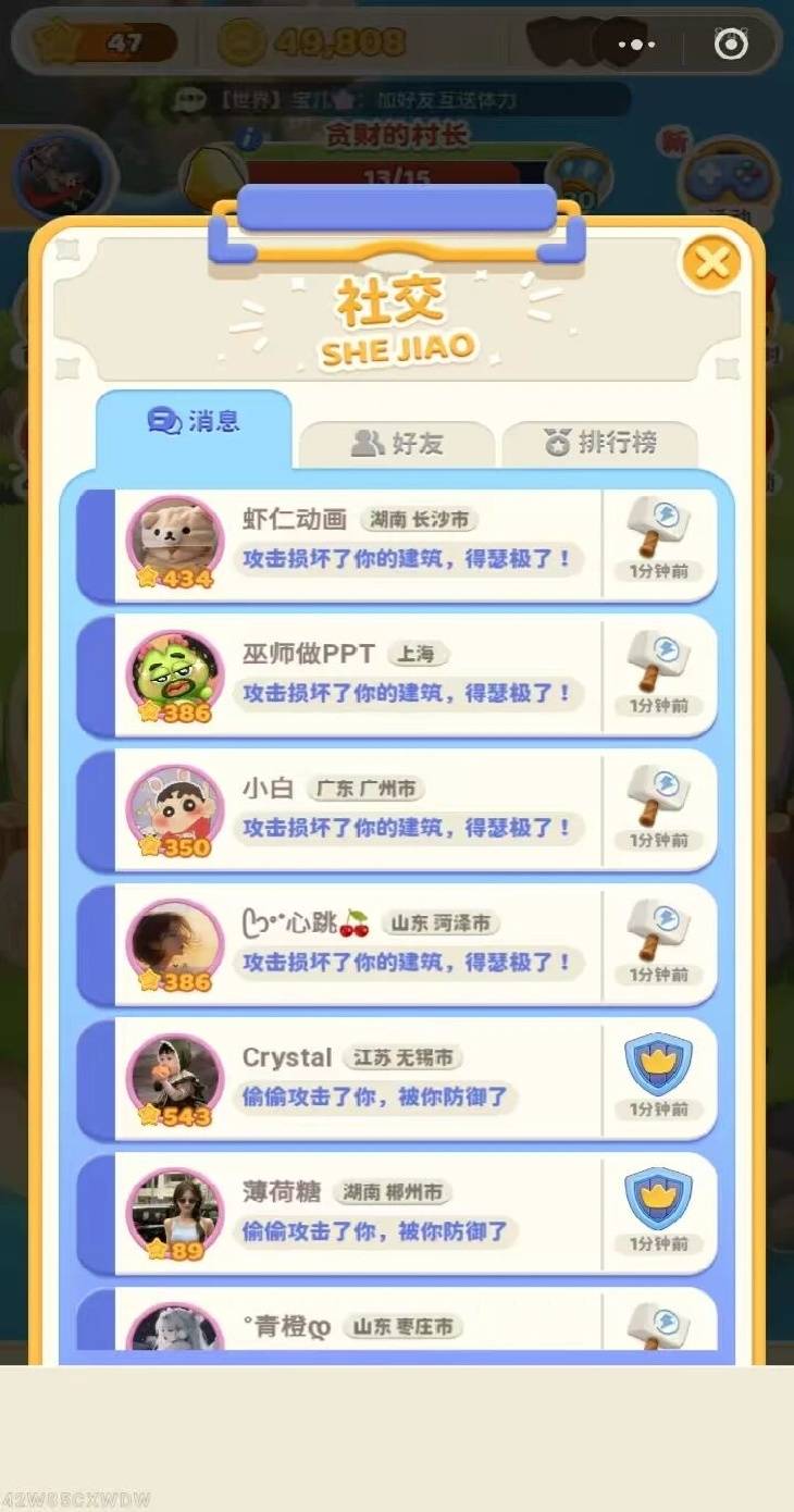 玩家在《月之村》初始体验游戏的前数十分钟时,会容易面临两个场景:玩家的体力欠缺,以及显著的被掠夺频次。T3-MCC类游戏中,玩家账号身处不同阶段时,对应的体验不同。当大部分玩家处于同一阶段时,资产掠夺会频繁,从而刺激玩家在线粘性。此时,玩家在线期间获取的资产将被迅速使用,而相对高频的被掠夺无形中提供了步骤的额外消耗。匹配机制上,T3-MCC类游戏中,玩家将会基于建筑进度范围作为暗中分组划定,且以不对等形式划定。如玩家建筑到达第20关的玩家,触发掠夺、偷取等互动环节时,不会匹配到仅到达前3关的玩家。相反,若玩家处于初期时,在实现掠夺、偷取等场景,会出现等级比他高于一定范围的玩家。当大部分玩家身处一定阶段的关卡以后,若玩家此时创建游戏时,游戏内资产则会快速提升。因此,《月之村》在游戏初期特征上,人机出现的频率相对较高,以提升用户单日多次打开游戏频次的效果。同样,若玩家前后登录时间间距较长时,修复建筑所需的金币也会与建筑单次升级1级所需的金币规模持平。另外,《月之村》玩家初期受掠夺的纪录中,无论是机器人还是真实用户,大多数都是异性玩家属性,利用异性社交形成第一重吸引。我们认为,《月之村》的初始服务对象,更适合以女性用户为首。T3-MCC的品类特征,不断弹出奖励特效会对用户打断资源投入,从而形成“快一点”“急死我了”等用户心理。对应地,存在这些心理且愿意留在游戏内继续游玩的,更高概率为女性用户。从这角度看,使用的用户信息头像,应当是偏向男性用户为吸引力。
