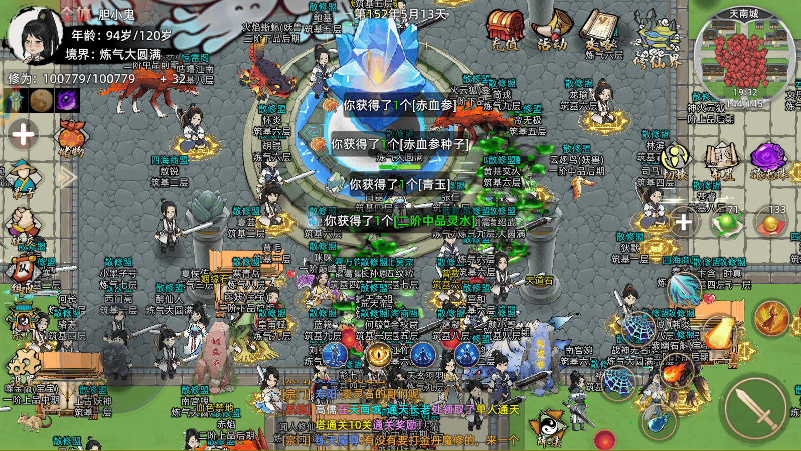 《修仙家族模拟器2》:修仙类的爆款游戏,就目前的测试阶段(删档)就人气非常火爆,正式服的话预计与明年一月初上线,当下正式提前了解游戏的好时机。每个区内少则几千多则上万人。搬砖轻松,矿石、丹药、功法、装备等搬砖点非常丰富,有面对面、摆摊交易。
